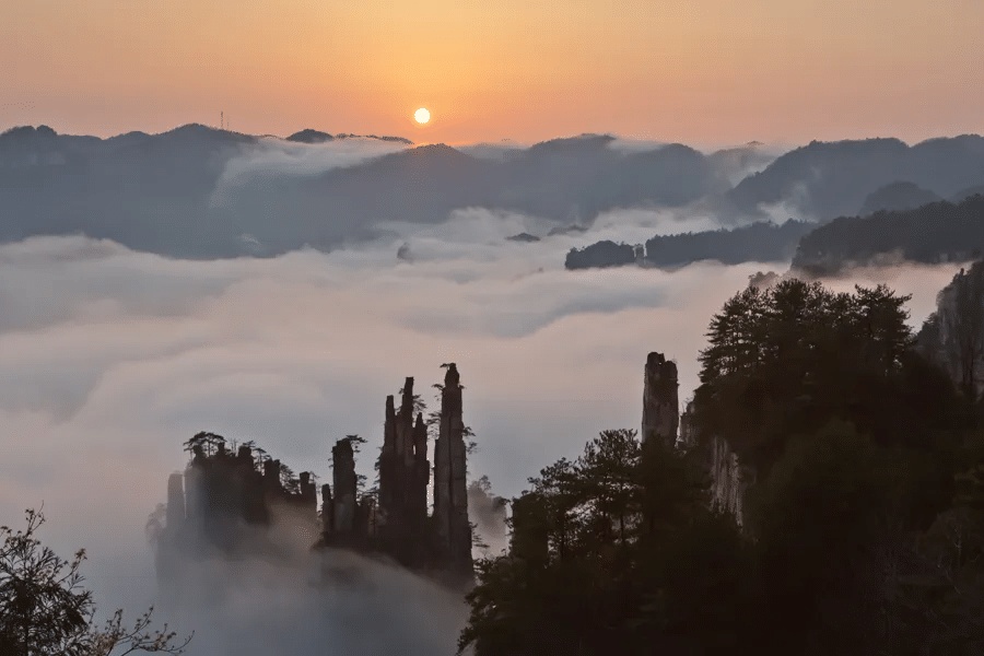 2. 1314系马桩日出点:与天空之眼形成“一生一世(1314)+要我爱你(1520)”的浪漫联动,这座海拔1314米的山峰是观赏日出的绝佳视角。清晨时分,朝阳从云海中跃出,将悬崖绝壁染成金红色,光影流转间,远处的天门山轮廓清晰可见。这里曾是古代土家山寨的瞭望台,清代史料记载的“上营、中营、下营”遗迹隐约可寻,站在山顶仿佛能听见历史与自然的共鸣。