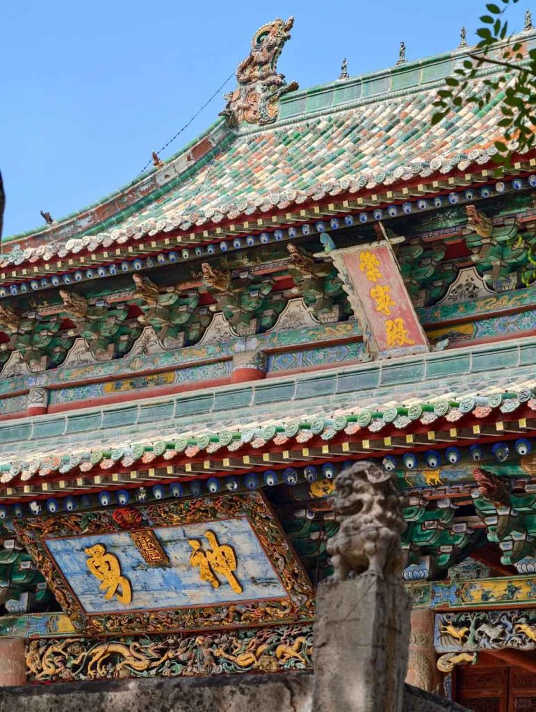 庙内唯一采用庑殿顶(中国古代屋顶最高等级)的建筑,面阔五间,彰显关羽“帝君”身份。两侧壁画“青龙吸水”“白虎啸林”栩栩如生。